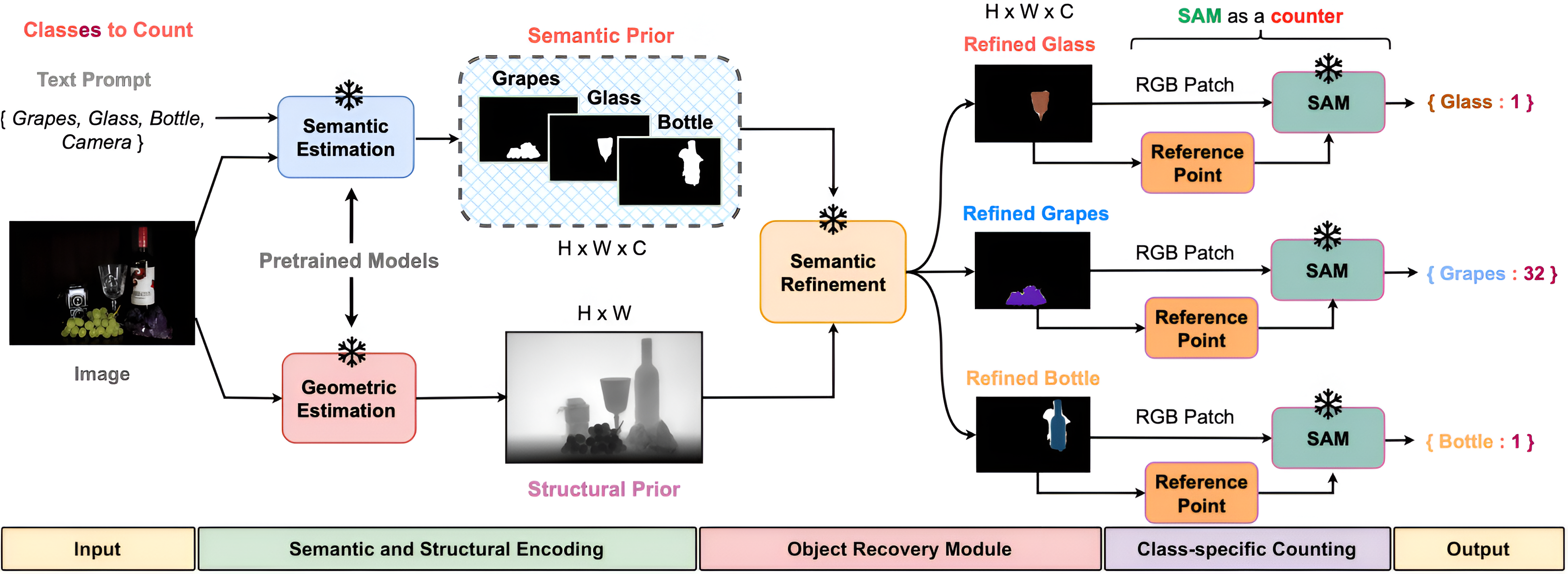 OmniCount Pipeline: Our method starts by processing the input image and their target object classes, using Semantic Estimation and Geometric Estimation modules to generate class-specific masks and depth maps. These initial priors are refined with a Semantic Refinement module for accuracy, creating precise binary masks of target objects. The refined masks help in obtaining RGB patches for each class and also extracting reference points to reduce overcounting. SAM uses these RGB patches and reference points to create instance-level masks, yielding precise object counts. ❄ represents frozen pre-trained models.
